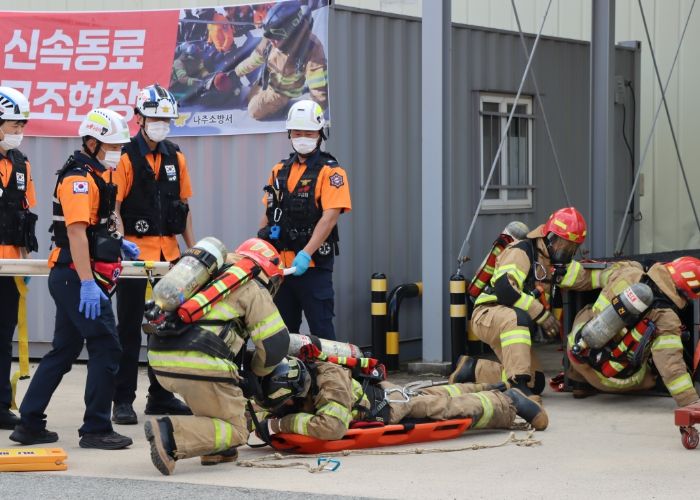 한방통신사 신다은기자 기자 | 나주소방서는 29일 3M나주 공장에서 지자체, 경찰, 군부대, 관계기관 등이 참여한 가운데 긴급구조 종합훈련을 실시했다.