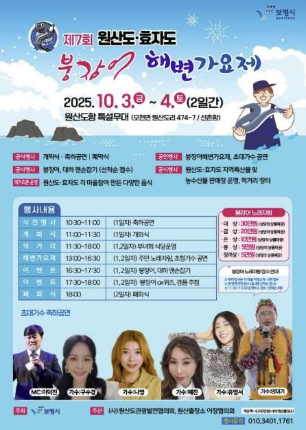 한방통신사 신태공 기자 | 보령시가 주최하고 (사)원산도관광발전협의회가 주관하는 ‘제7회 원산도·효자도 붕장어 해변가요제’가 오는 10월 3일부터 4일까지 2일간 원산도항 특설무대에서 개최된다.
