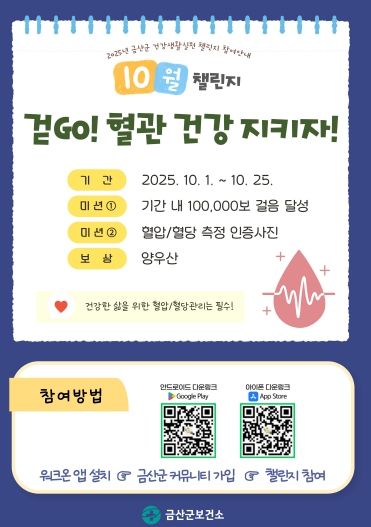 한방통신사 신태공 기자 | 금산군보건소는 사진인증으로 함께하는 2025 건강생활실천 ‘걷고(GO)! 혈관 건강 지키자!’ 챌린지를 오는 25일까지 진행한다.