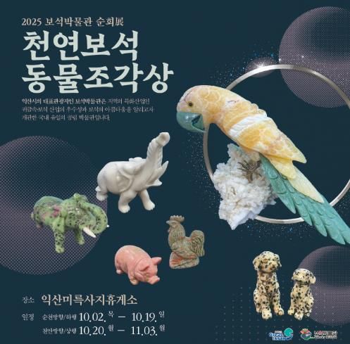 한방통신사 김성의 기자 | 익산시 보석박물관은 추석 연휴가 시작되는 10월 2일부터 11월 3일까지 익산미륵사지휴게소(양방향)에서 '천연보석 동물조각상' 순회전시를 진행한다.