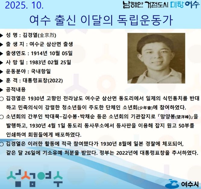 한방통신사 신다은기자 기자 | 여수시는 2025년 10월의 독립운동가로 전라남도 여수군 삼산면 출신의 ‘김경열(金京烈)’ 선생을 선정했다.