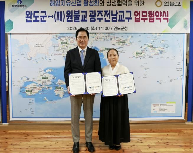 한방통신사 신다은기자 기자 | 완도군이 완도 해양치유산업 활성화를 위해 (재)원불교 광주전남교구와 업무 협약을 체결했다.