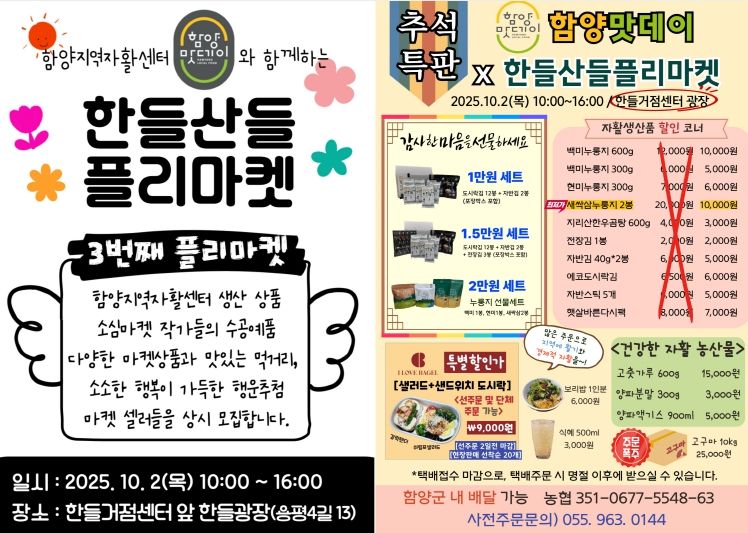 한방통신사 신유철기자 기자 | 함양군은 10월 2일 오전 10시부터 오후 4시까지 한들거점센터 앞 한들광장에서 ‘한들산들 플리마켓’ 3회차 행사를 개최한다.