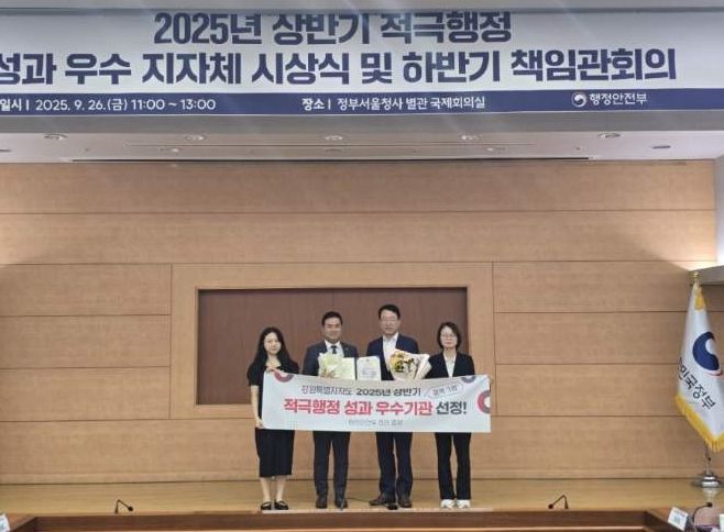 한방통신사 신유철기자 기자 | 강원특별자치도가 행정안전부 주관 ‘2025년 상반기 지방자치단체 적극행정 성과 점검’에서 전국 광역자치단체 중 유일하게 우수기관으로 선정돼 행정안전부 장관 표창을 수상했다.