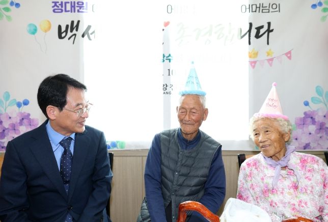 이날 100세 어르신께 드리는 청려장과 함께 과일·참치세트 등 위문품을 전달했으며, 케이크 커팅과 기념촬영을 통해 참석자 모두가 어르신들의 장수를 축하하는 시간을 가졌다.