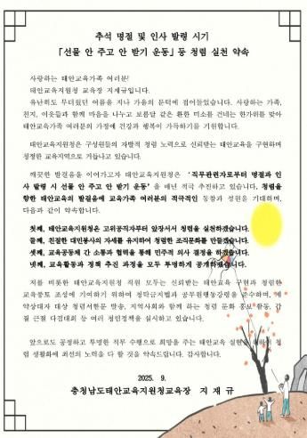 한방통신사 신태공 기자 | 충청남도태안교육지원청은 추석 연휴 시기를 맞아 청렴한 공직문화를 확산하기 위해 ‘선물 안 주고 안 받기 운동’을 강조하는 청렴 서한문을 홈페이지에 게시했다.