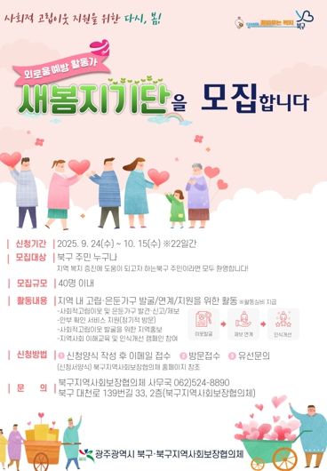 ‘새봄지기단’은 북구 주민 누구나 참여할 수 있으며 관심 있는 주민은 북구 지역사회보장협의체 누리집을 참고해 신청서를 이메일 또는 방문 접수하면 된다.