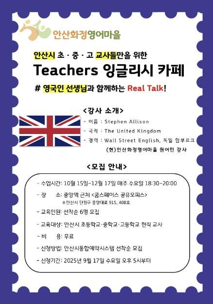 한방통신사 신유철기자 기자 | 안산시 안산화정영어마을은 오는 15일부터 12월 17일까지 관내 소속 교사를 대상으로 ‘티처스(Teachers) 잉글리시 카페’를 운영한다고 10일 밝혔다.