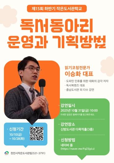 천안시 작은도서관 종사자 누구나 참석 가능하며, 오는 28일까지 천안시도서관 누리집에서 신청하면 된다.