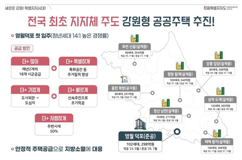 한방통신사 신유철기자 기자 | 강원특별자치도는 청년과 신혼부부 등 지역 정착 인구 확대를 위한 안정적인 주택공급을 목표로 전국 최초의 지자체 주도형 주거모델인 강원형 공공주택 사업을 적극 추진하고 있다고 밝혔다.