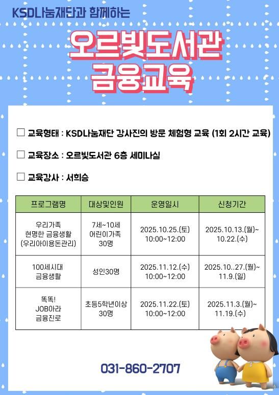 한방통신사 신유철기자 기자 | 동두천시 도서문화사업소는 KSD나눔재단과 함께 10월 25일부터 11월 22일까지 오르빛도서관 6층 세미나실에서 세대별 맞춤형 금융교육 프로그램을 운영한다.