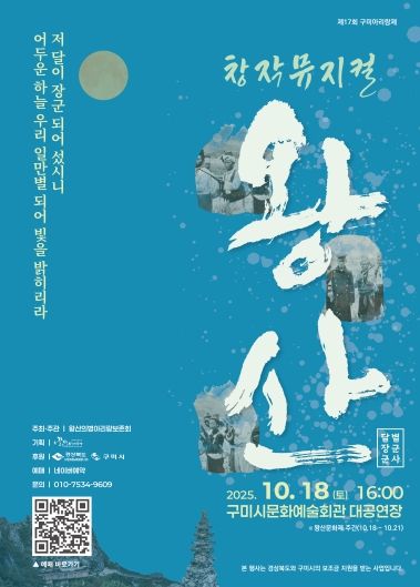 한방통신사 신유철기자 기자 | 구미시는 ‘2025 제17회 구미아리랑제 창작뮤지컬 왕산’을 10월 18일 오후 4시 구미문화예술회관 대공연장에서 개최한다. 경상북도와 구미시가 후원하는 이번 공연은 구미 출신 독립운동가 왕산 허위 선생의 일대기를 뮤지컬과 영남 지역 민요로 풀어내며, 당시 백성들의 항일정신과 민족의지를 생생하게 전할 예정이다.