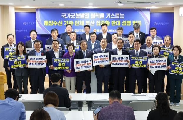 한방통신사 신다은기자 기자 | 전라남도의회 농수산위원회 최동익 의원(더불어민주당·여수)은 10월 15일 제394회 임시회 도의회 브리핑룸에서 '국가균형발전 원칙을 거스르는 해양수산 기관·단체 부산 집중화 반대 성명서'를 발표했다.