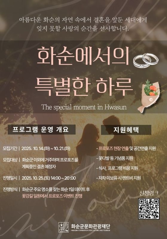 모집은 10월 14일(화)부터 10월 21일(화) 18:00까지로 화순군 외 지역에 거주하며 프로포즈를 계획 중인 커플 1팀을 모집한다. 신청은 별도의 폼 작성을 통한 온라인 접수로 가능하며, 최종선정자는 10월 22일(수) 개별 안내 예정이다.