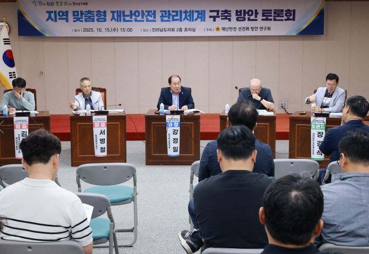 한방통신사 신다은기자 기자 | 전라남도의회 의원 연구단체인'재난안전 선진화 방안 연구회'는 지난 10월 15일 전라남도의회 초의실에서 강정일 대표의원(광양2) 주재로 ‘지역 맞춤형 재난안전 관리체계 구축 방안’에 대한 토론회를 개최했다.