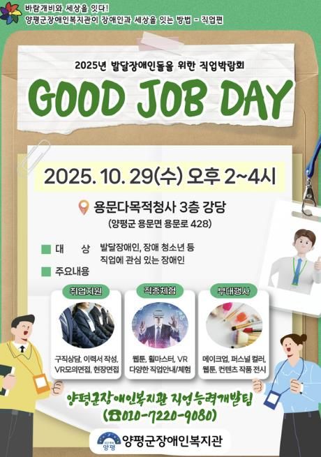 한방통신사 신유철기자 기자 | 대한불교조계종사회복지재단이 운영하는 양평군장애인복지관은 오는 29일 오후 2시부터 4시까지 용문다목적청사 3층 강당에서 발달장애인의 직업 탐색 기회를 지원하기 위한 직업박람회 ‘GOOD JOB DAY’를 개최한다.