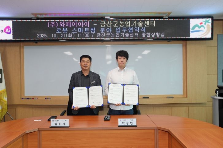 한방통신사 신태공 기자 | 금산군농업기술센터와 인공지능 로봇 개발 기업 ㈜와에이아이는 지난 21일 센터 종합상황실에서 잎들깨 전용 지능형 수확로봇 개발과 스마트팜 기술 고도화 업무협약을 체결했다.