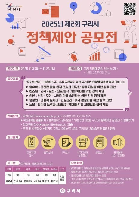 한방통신사 신유철기자 기자 | 구리시는 오는 11월 3일부터 11월 23일까지'2025년 제2회 구리시 정책 제안 공모전'을 개최한다고 밝혔다. 이번 공모전의 주제는 ‘구리 시민(영유아·청소년·청년·중장년·노년) 나이별 맞춤형 정책 아이디어’다.