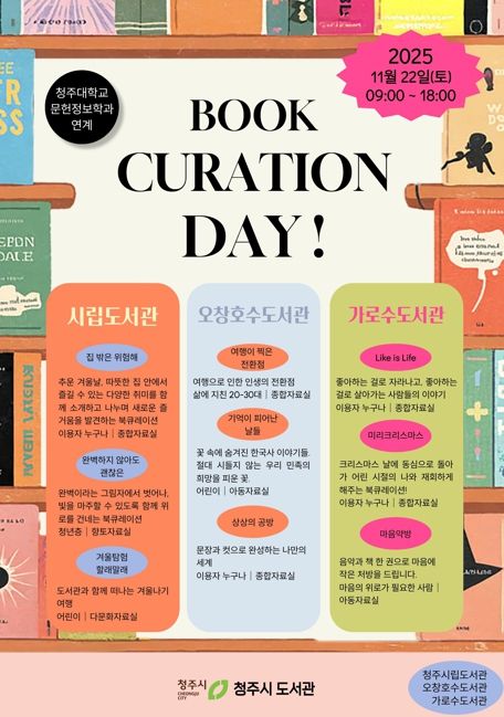 한방통신사 권영분기자 기자 | 청주시립도서관은 청주대학교 문헌정보학과(지도교수 김혜영)와 함께 오는 22일 오전 9시부터 오후 6시까지 △시립도서관 △오창호수도서관 △가로수도서관 등 3개 도서관에서 ‘북큐레이션 데이’를 동시에 개최한다고 밝혔다.