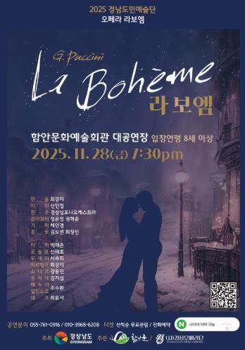 한방통신사 신유철기자 기자 | 함안군은 푸치니의 대표작 오페라 〈라 보엠〉을 오는 2025년 11월 28일 오후 7시 30분, 함안문화예술회관 대공연장에서 전석 무료로 선보인다고 밝혔다.