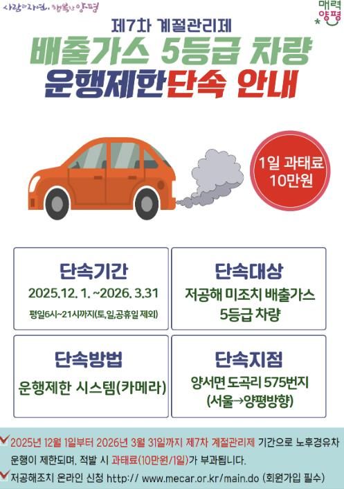 한방통신사 신유철기자 기자 | 양평군(은 오는 12월 1일부터 2026년 3월 31일까지 제7차 미세먼지 계절 관리제 시행에 따라 배출가스 5등급 차량에 대한 운행 제한 단속을 시행한다고 밝혔다.