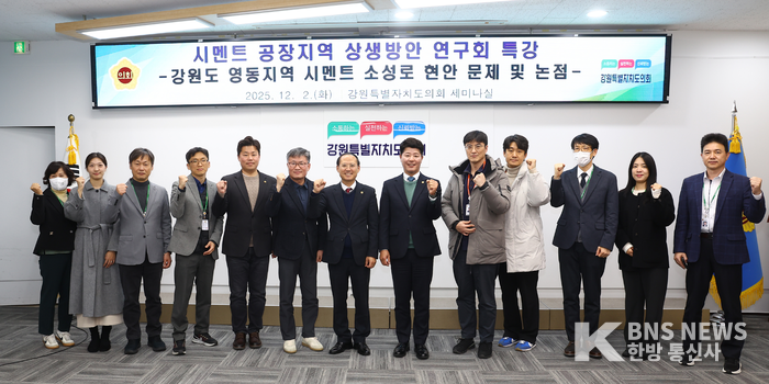 강원특별자치도의회 의원연구단체 ‘시멘트 공장지역 상생방안 연구회’(회장 김기하 의원, 간사 김용래 의원)가 12월 2일 오후 5시 도의회 세미나실에서 ‘강원도 영동지역 시멘트 소성로 현안 문제 및 논점’을 주제로 특강을 열었다.