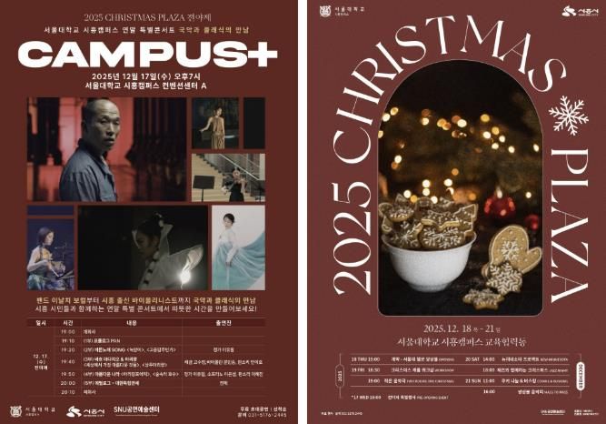 한방통신사 신유철기자 기자 | 시흥시와 서울대학교 시흥캠퍼스가 오는 12월 17일부터 21일까지 특별 행사인 ‘2025 크리스마스 플라자(CHRISTMAS PLAZA)’를 개최한다. 올해 행사는 단 하루만 열리는 전야제 특별콘서트 ‘캠퍼스 플러스’를 중심으로, 국악과 클래식을 대표하는 최정상급 연주자들이 한자리에 모여 연말 분위기를 고조시킬 예정이다.