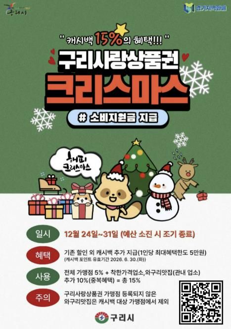 한방통신사 신유철기자 기자 | 구리시는 12월 24일부터 ‘구리사랑상품권 크리스마스 소비 지원금’을 지급한다고 밝혔다. 이번 소비 지원금은 연말연시 기간 지역 외로 유출되는 소비를 지역 내로 유도하고, 관내 상권 활성화와 소상공인 보호를 위해 마련됐으며, 예산 소진 시 조기 종료될 수 있다.