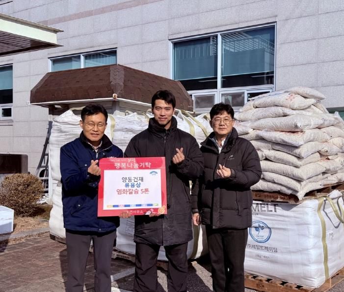 한방통신사 신유철기자 기자 | 양평군 양동면은 지난 19일 양동건재 류용상 씨가 양동면사무소를 방문해 겨울철 제설작업에 사용될 염화칼슘 5톤을 기탁하며 지역사회 안전과 이웃사랑 실천에 동참했다고 밝혔다.