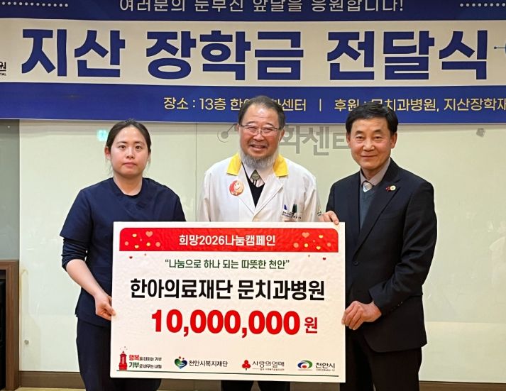 한방통신사 신태공 기자 | (재)천안시복지재단은 지난 22일 한아의료재단 문치과병원이 학업장려금 3,000만 원을 기탁했다고 밝혔다.