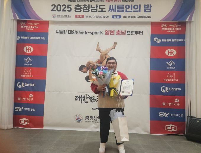 한방통신사 신태공 기자 | 지난 23일 충남 당진시 A웨딩홀에서 열린 '2025년 충남 씨름인의 밤' 행사에서 청양초등학교 김민규(38) 씨름 감독이 충남교육감 표창을 수상하며 큰 주목을 받았다.