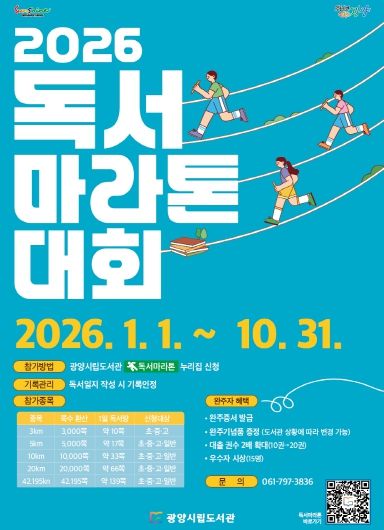 한방통신사 신다은기자 기자 | 광양시립도서관이 지역사회에 독서문화 확산을 위해 2026년 1월 1일부터 10월 31일까지 ‘2026 광양시 독서마라톤 대회’를 운영한다.