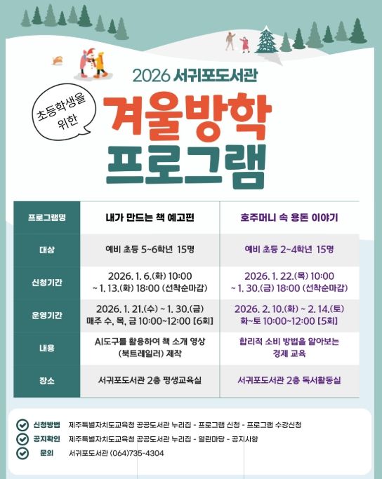 한방통신사 신유철기자 기자 | 제주도교육청 서귀포도서관은 겨울방학을 맞아 어린이들의 호기심을 자극해 책 읽기의 즐거움과 경제 감각을 키우는 겨울방학 프로그램을 운영하며, 내년 1월 6일부터 참가자를 모집한다.
