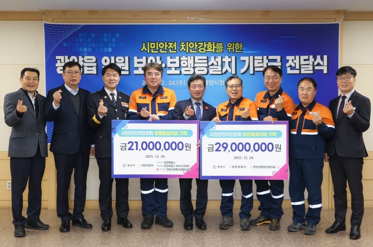 이날 포스코광양제철소, 광양경찰발전협의회, 광양제철소파트너사협회 3개 기업·단체가 주민 생활안전 개선에 뜻을 모아 총 5,000만 원의 기탁금을 전달했다. 기탁금은 관내 취약지역에 블랙박스 보안등 11등과 고효율 LED 보행등 30등을 설치하는 데 사용될 예정이다.