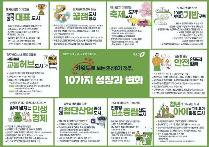 10대 성과는 시민의 삶과 직결된 민생안정은 물론, 청주의 100년 미래 먹거리가 될 첨단산업과 균형발전까지 아우르고 있어 대한민국 대표 도시로 도약한 청주시의 위상을 보여주고 있다.