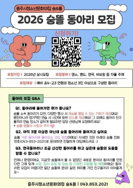 한방통신사 권영분기자 기자 | 충주시청소년문화의집 숨&뜰은 2026년 한 해 동안 청소년들의 자율적인 문화 활동을 지원하기 위해 청소년 동아리를 상시 모집한다고 밝혔다.