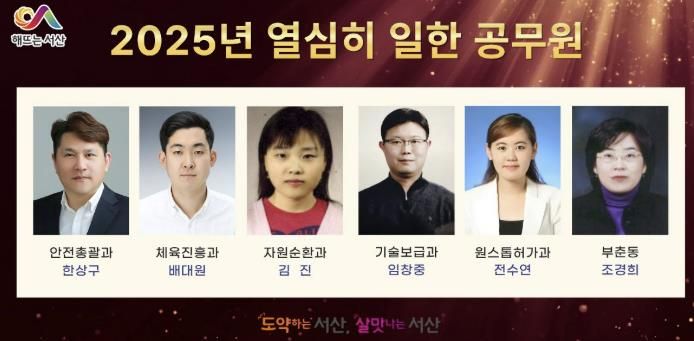 한방통신사 신태공 기자 | 충남 서산시는 올해 시정 발전과 시민 삶의 질 향상을 위해 노력한 공무원 6명을 ‘열심히 일한 공무원’으로 선정했다고 밝혔다.