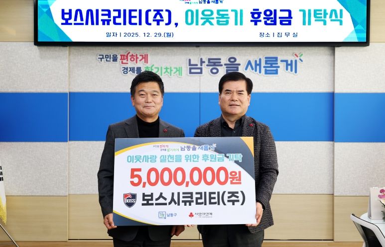 한방통신사 신유철기자 기자 | 인천시 남동구는 보스시큐리티 주식회사(대표이사 공병석)로부터 사회복지시설 및 단체 지원을 위한 후원금 5백만 원을 기탁받았다고 31일 전했다.