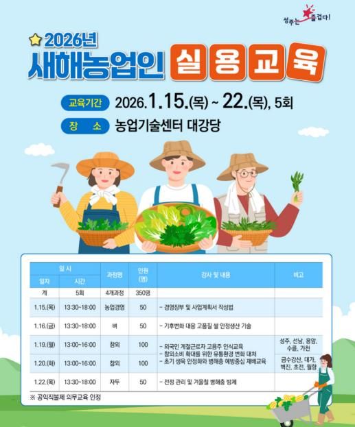 한방통신사 신유철기자 기자 | 성주군은 오는 1월 15일부터 22일까지 농업기술센터 대강당에서 지역 농업인 350여명을 대상으로 '2026년 새해농업인실용교육'을 실시한다.