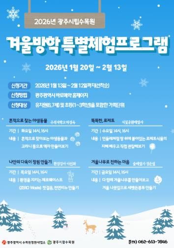 한방통신사 김성의 기자 | 광주광역시 시립수목원은 어린이를 위한 ‘2026년 겨울방학 체험 프로그램’ 참가자 640명을 오는 13일 오전 10시부터 선착순 모집한다.