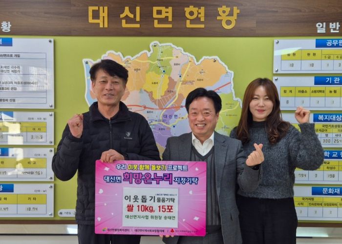 송태연 위원장은 “기부를 권하면서 스스로 실천하지 못한 것 같아 마음에 걸렸다. 작은 정성이지만 이웃들에게 도움이 되길 바라고 앞으로도 대신면 지역사회보장협의체 활성화와 복지사각지대 없는 대신면을 만들기 위해 최선을 다하겠다.”고 말했다.