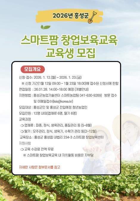이승복 홍성군농업기술센터소장은 “스마트팜 창업보육교육은 실제 영농 전 과정을 경험하게 하는 창업 실전형 교육으로 스마트농업에 대한 실질적인 역량을 키울 수 있는 좋은 기회”라며, “스마트농업 분야에 도전하고자 하는 농업인들의 적극적인 참여를 기대한다”고 말했다.