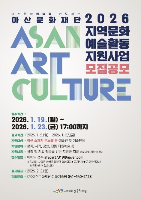 한방통신사 신태공 기자 | (재)아산문화재단은 지역 예술인의 안정적인 창작 환경을 조성하고 문화예술 생태계의 전문성을 강화하기 위해 ‘2026 지역문화예술 활동지원사업’ 공모를 시작한다.