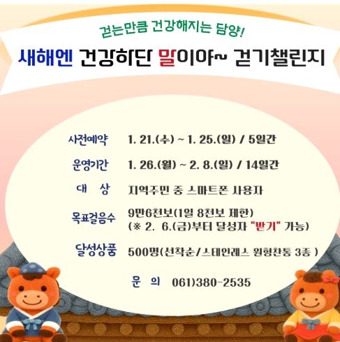 한방통신사 신다은기자 기자 | 담양군은 2026년 새해를 맞아 오는 1월 26일부터 2월 8일까지 온라인 걷기 챌린지 ‘새해엔 건강하단 말이야’를 운영한다고 밝혔다.
