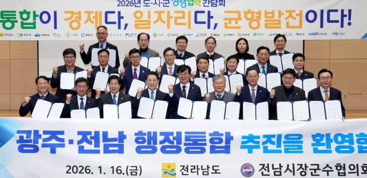 한방통신사 신다은기자 기자 | 전라남도는 16일 전남도청 왕인실에서 ‘2026년 도-시군 상생협력 간담회’를 열어 지역 대도약을 위한 광주·전남 행정통합 추진에 도와 22개 시군이 공동 보조를 맞추기로 했다.