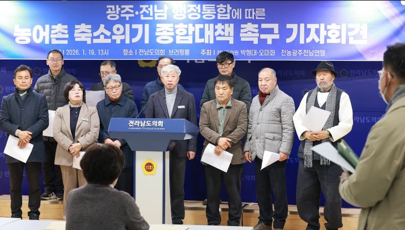 한방통신사 신다은기자 기자 | 전라남도의회 박형대 의원(진보당·장흥1)은 1월 19일 도의회 브리핑룸에서 기자회견을 열고 “광주ㆍ전남 행정통합 논의가 속도를 내고 있지만 농어촌 축소 위기에 대한 대비는 현저히 부족하다”며 농어촌 보호를 위한 구체적 합의를 요구했다.