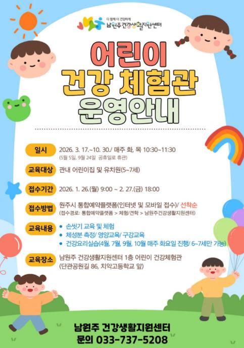 한방통신사 양호선기자 기자 | 남원주건강생활지원센터는 손 씻기, 영양 등을 주제로 미취학 아동들에게 건강 교육을 제공하는 ‘어린이 건강체험관’을 운영하고 있다.