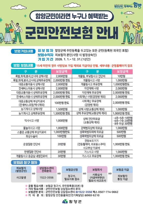 보험 기간은 2026년 1월 1일부터 12월 31일까지이며, 함양군에 주민등록을 둔 모든 군민은 별도의 절차 없이 자동으로 가입된다. 등록 외국인도 동일하게 혜택을 받을 수 있으며, 다른 지역으로 전출할 경우 자동으로 보험이 해지된다. 전입자의 경우 전입일로부터 보험 혜택이 적용된다.