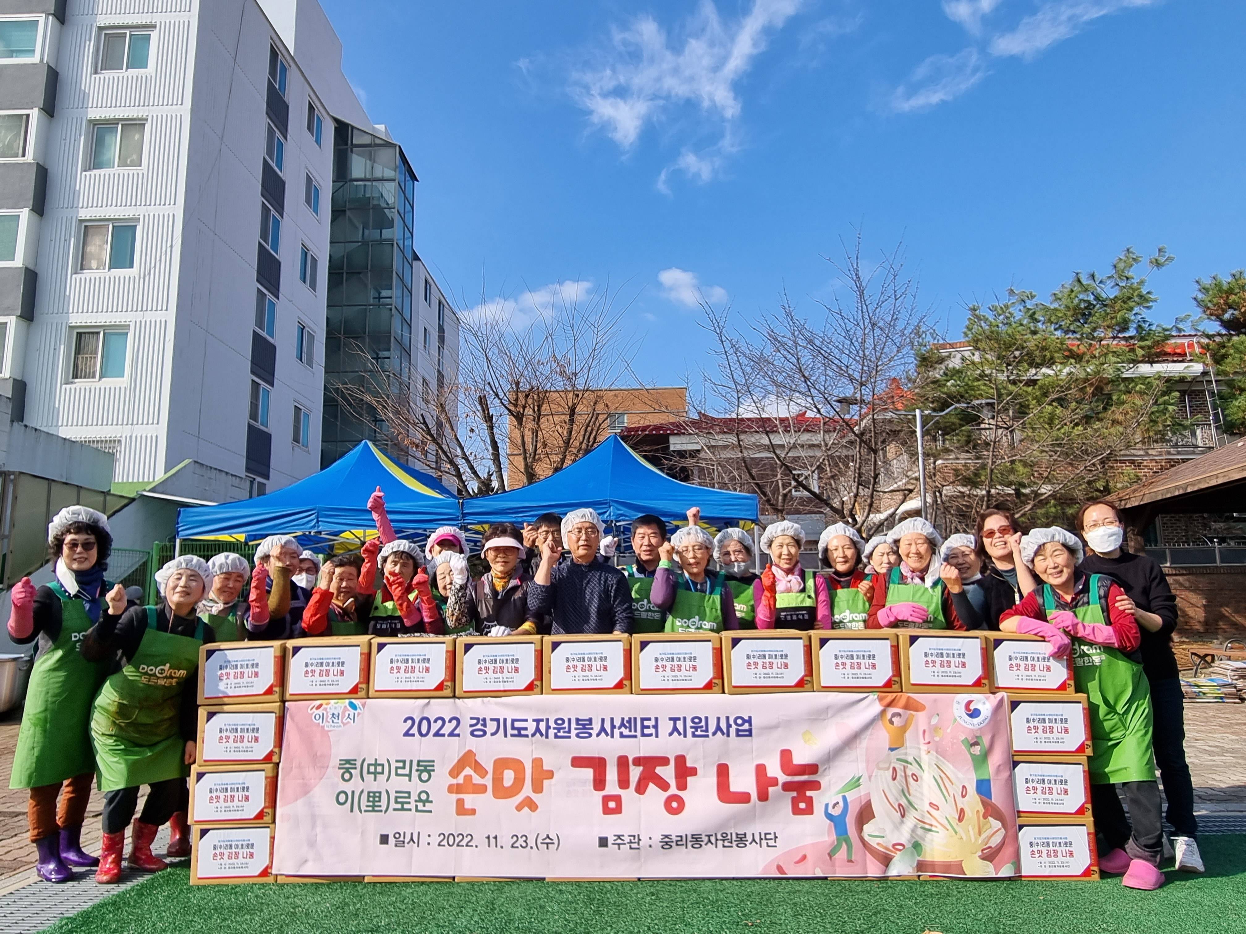 중리동자원봉사단은 지난 23일 2022년 경기도자원봉사센터 김장 공모사업에 선정되어 소외계층 100가구에 김장김치를 전달하는 『중(中)리동 이(里)로운 손맛 김장 나눔 행사』를 추진하였다.