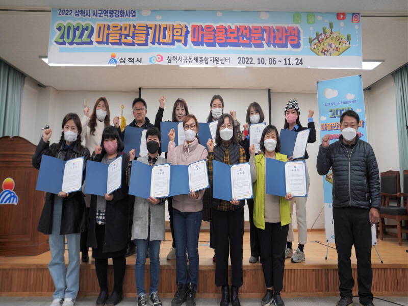 삼척시공동체종합지원센터는 지난 11월 24일 삼척시 농업인회관에서 삼척시 시군역량강화사업 ‘2022마을만들기대학 마을홍보전문가과정’ 수료식을 개최하였다.